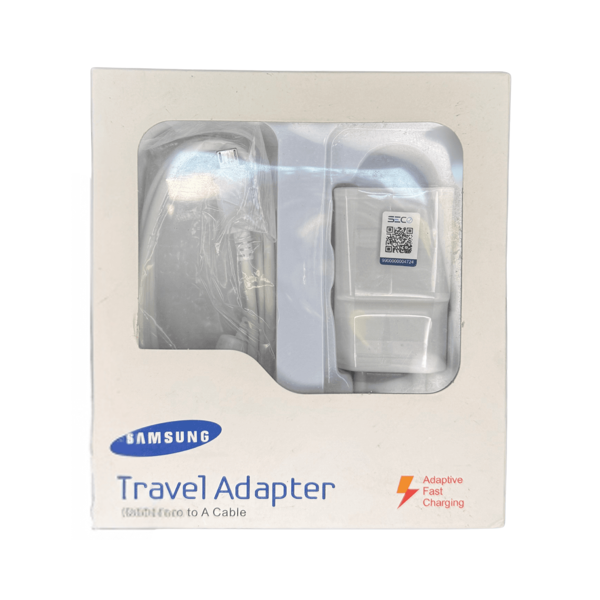Cargador de viaje Samsung con potencia de 15W y tecnología Adaptive Fast Charging. Incluye cable USB-A a Micro USB de 1 metro. Compatible con dispositivos Samsung y otros con entrada micro-USB. Ideal para carga segura y estable.
